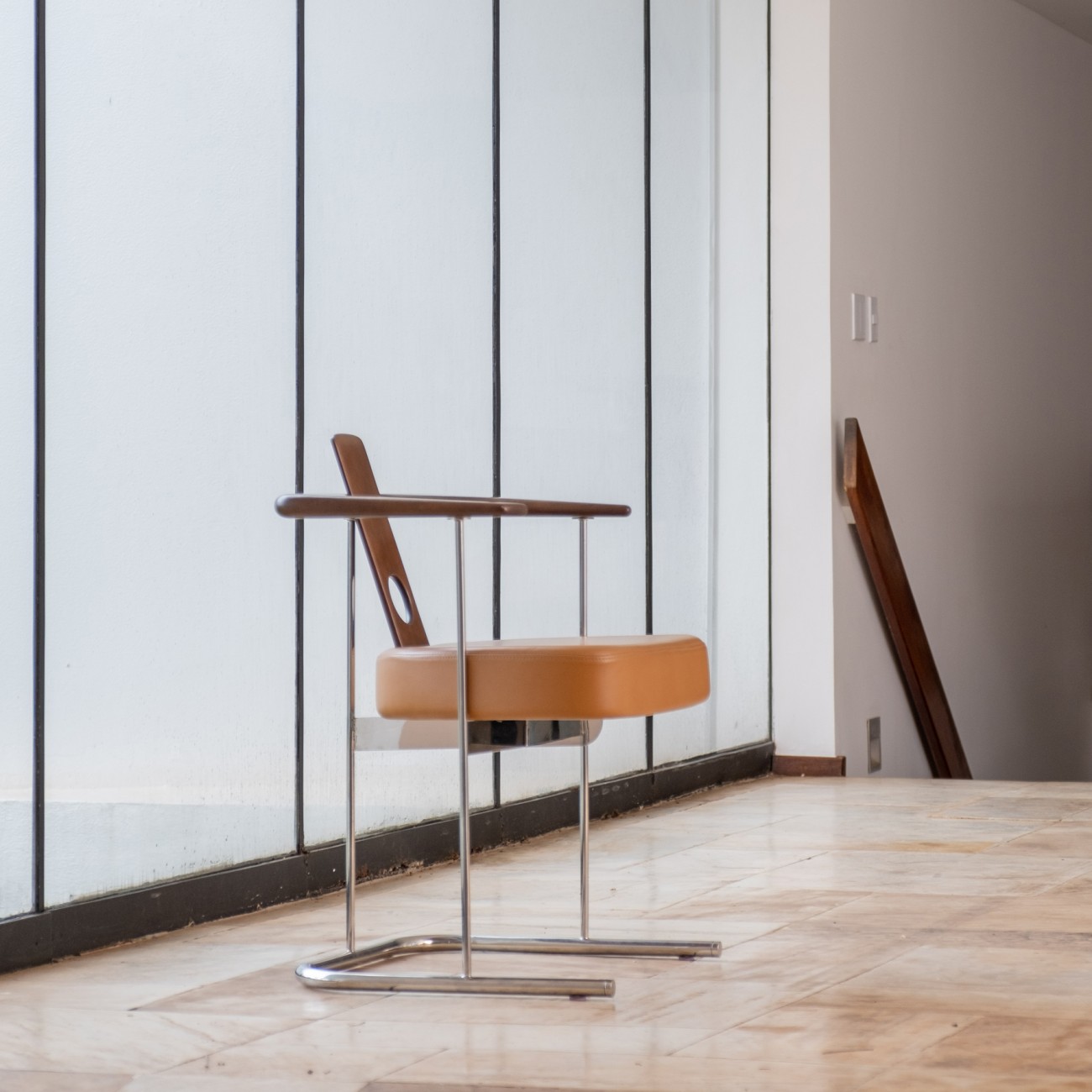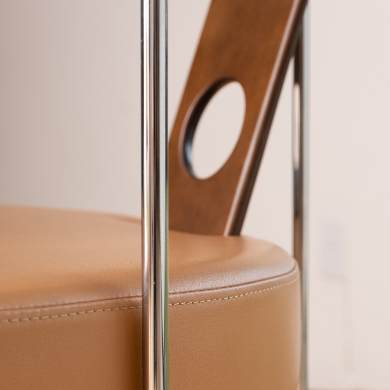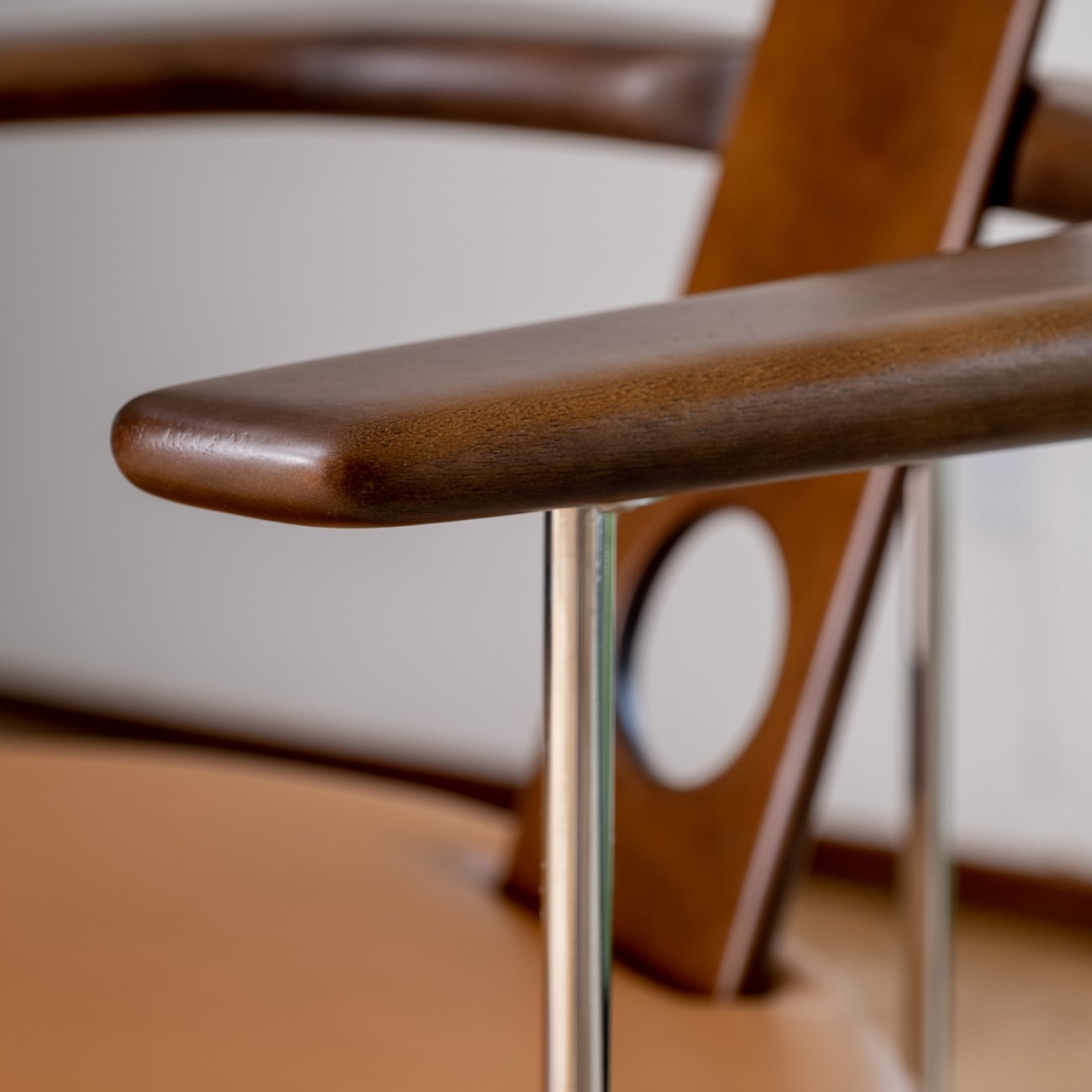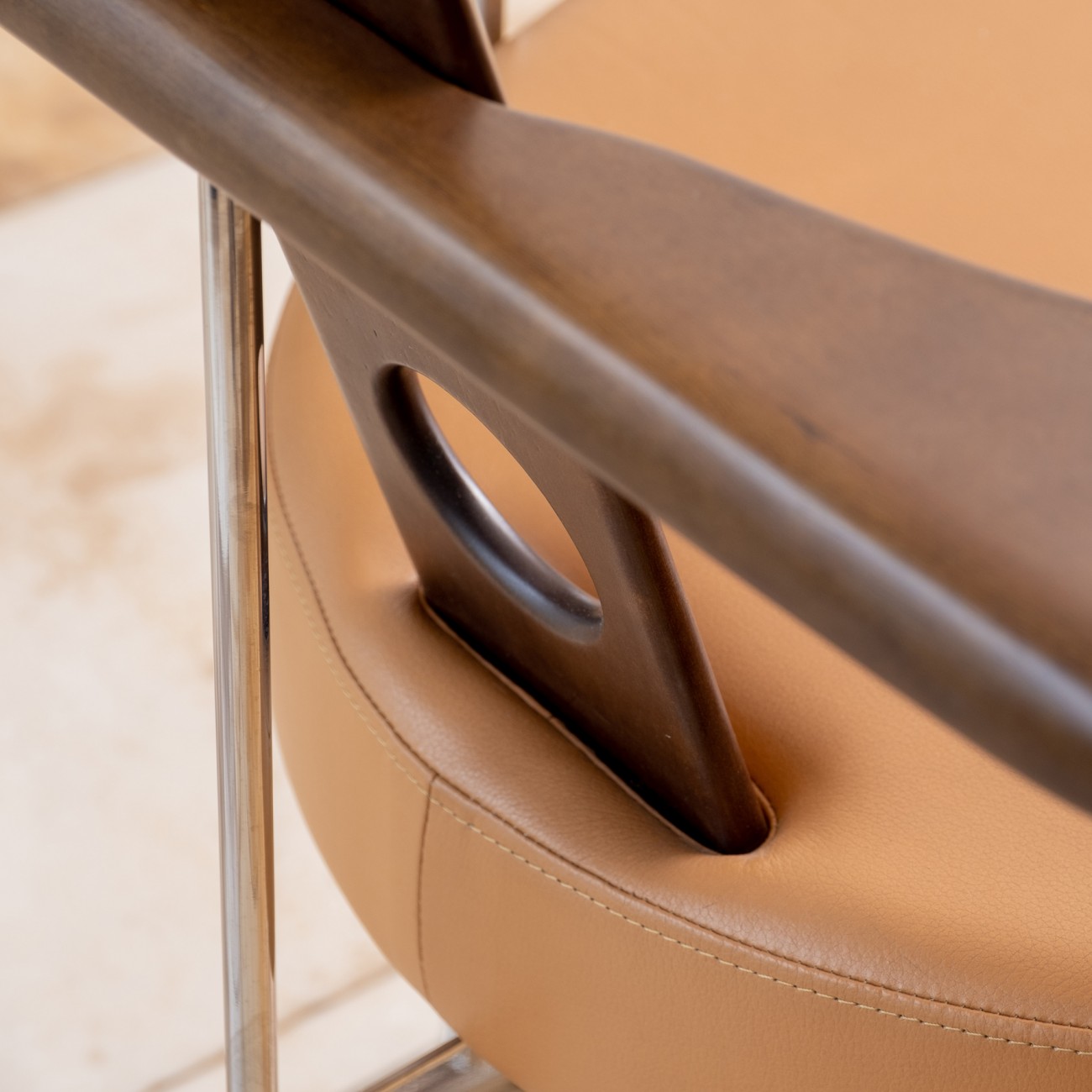 Structure made of stainless steel frame in polished steel, solid wood arms and back, upholstered seat with natural leather.