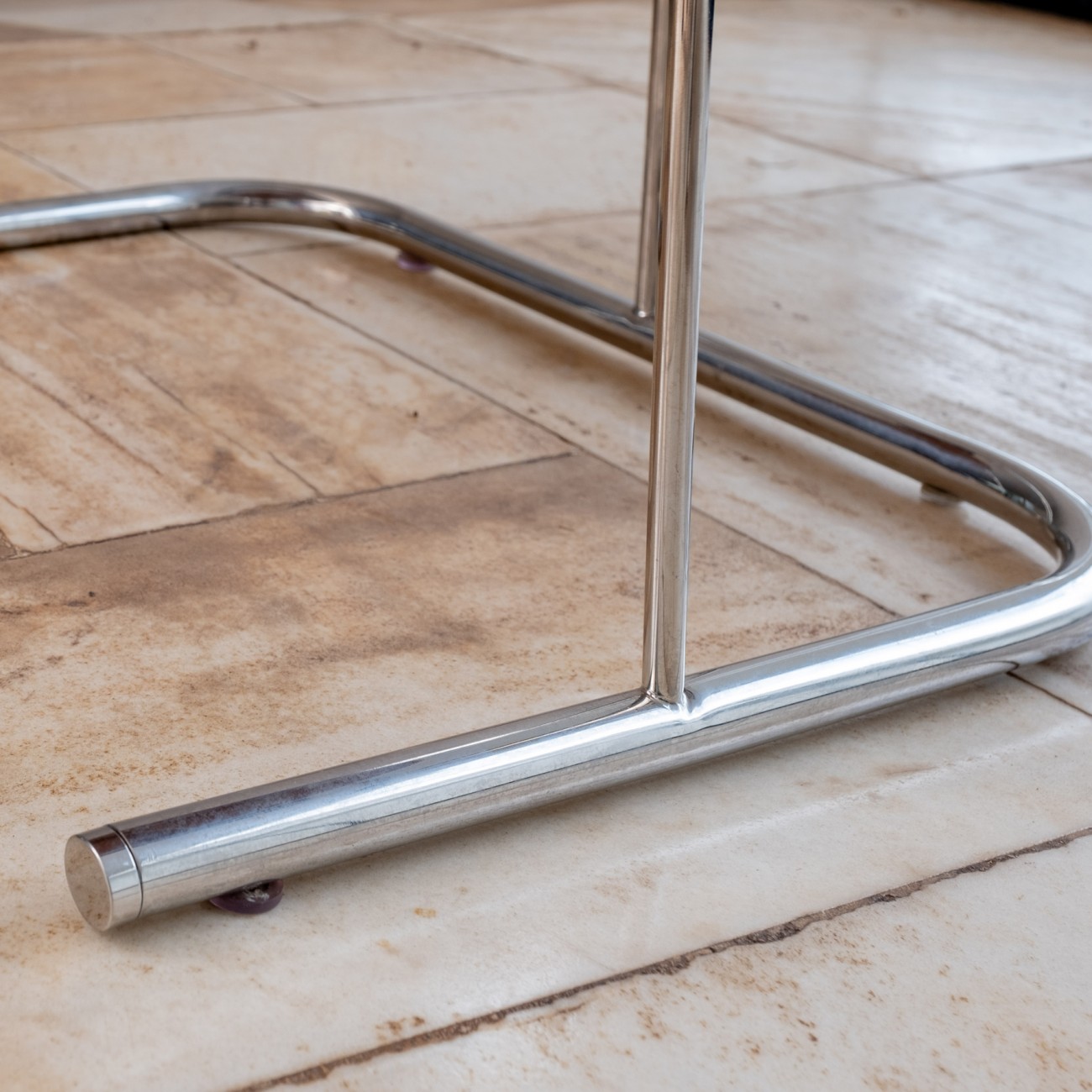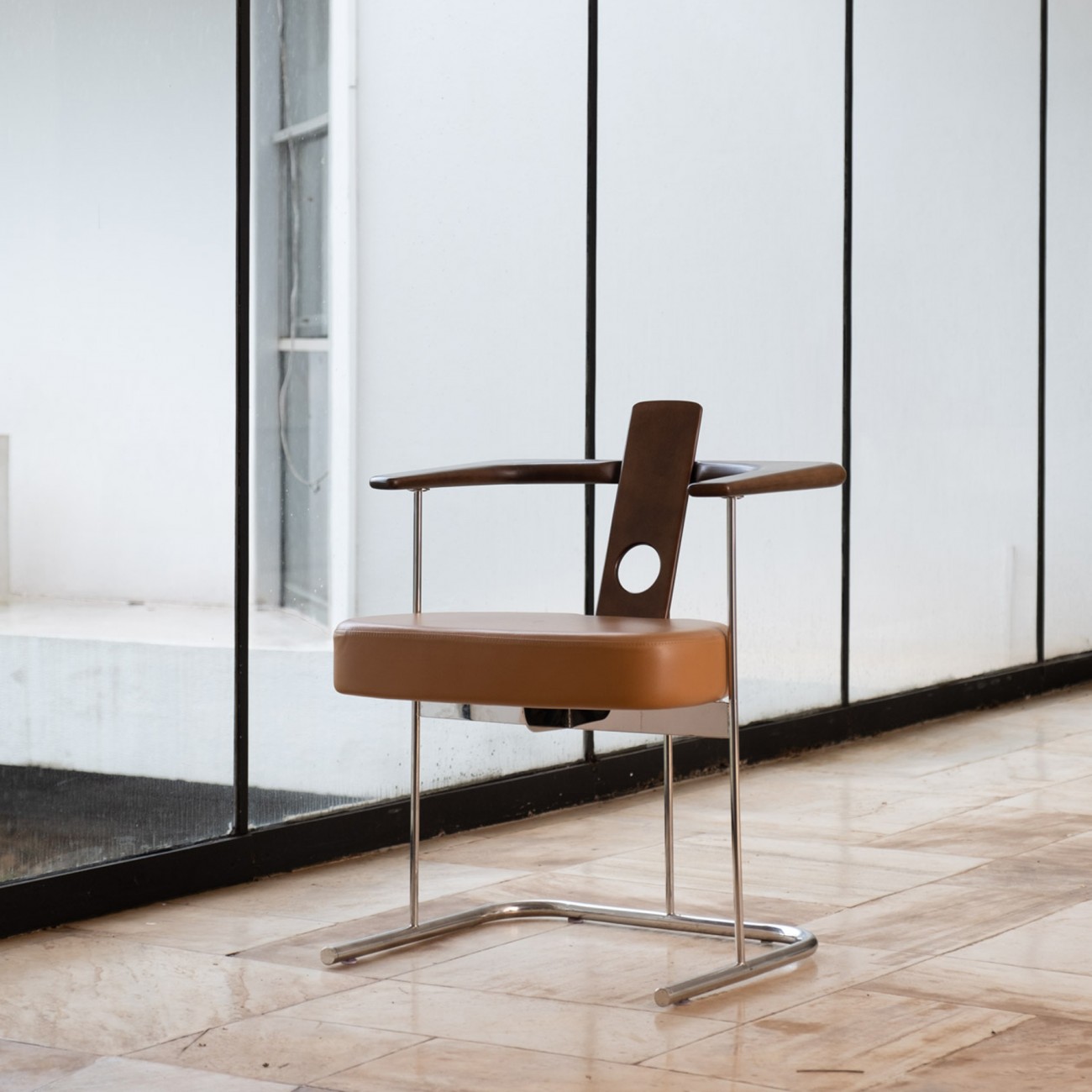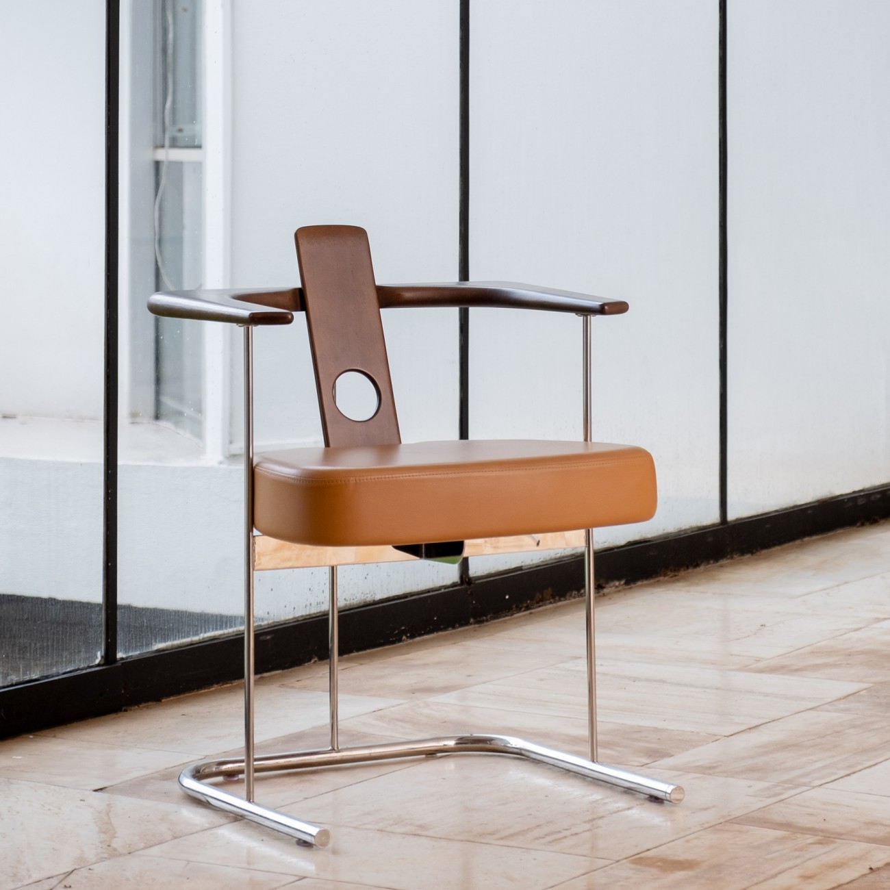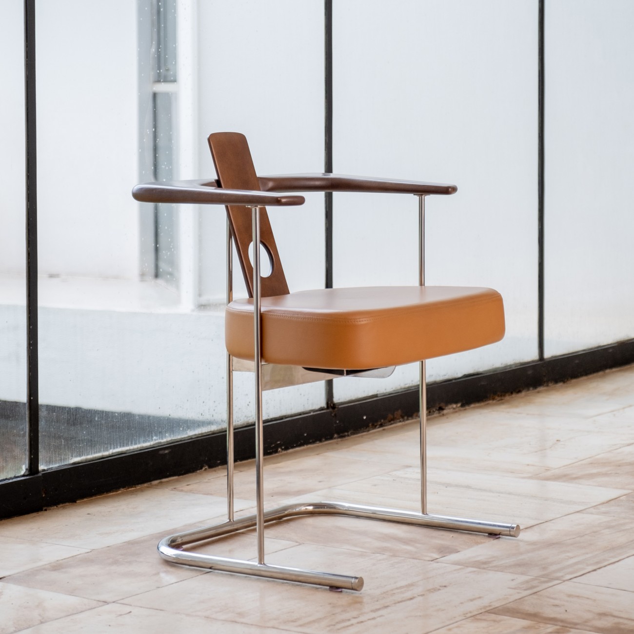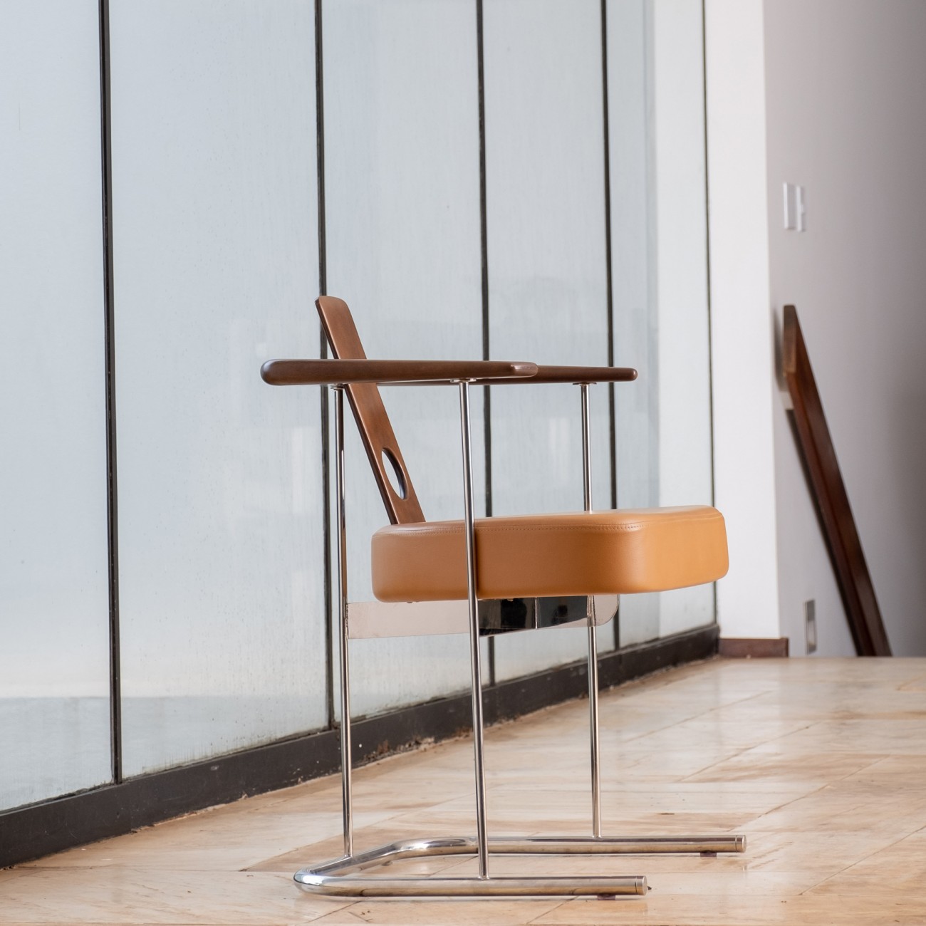 Structure made of stainless steel frame in polished steel, solid wood arms and back, upholstered seat with natural leather.