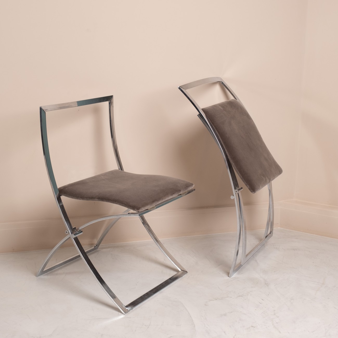 Peças dobráveis em metal cromado de alta qualidade com assentos inteiramente estofados a tecido premium.