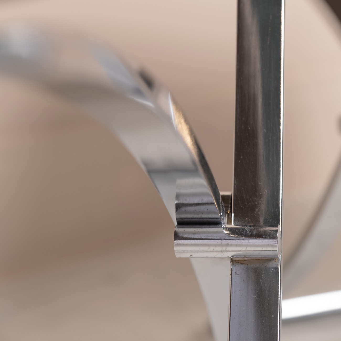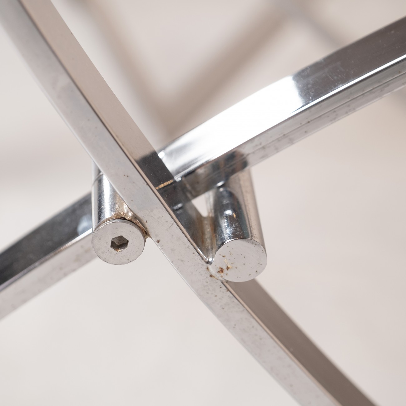O aço cromado de alta qualidade mantém o seu brilho intacto sem defeitos evidentes, apenas com ligeiros sinais de desgaste, típicos da idade.